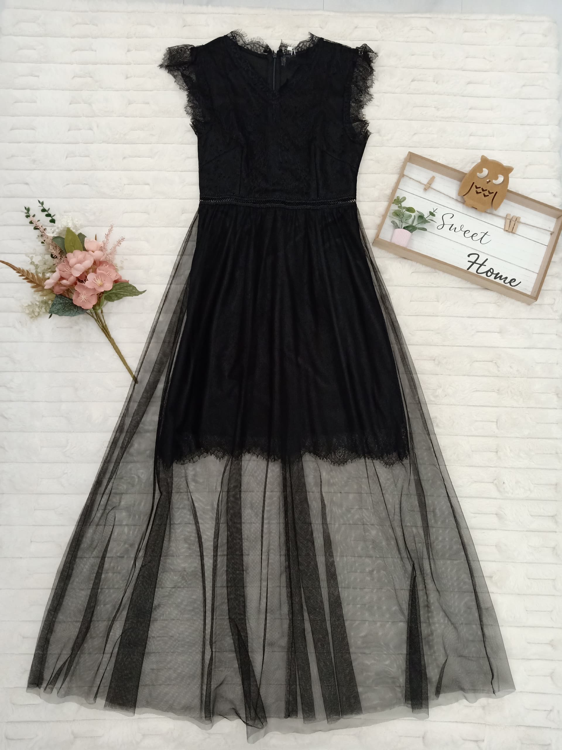 Cap Sleeve Mesh Lace Trim Overlay Gown
