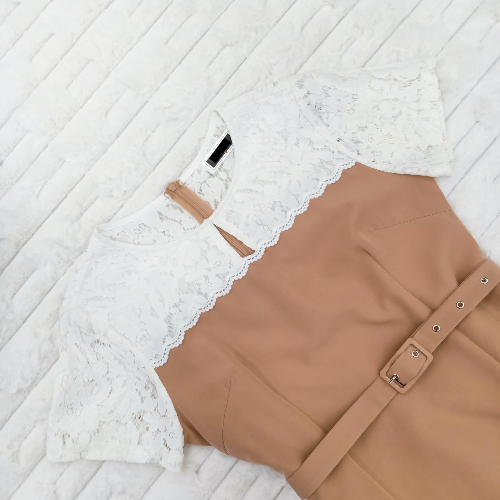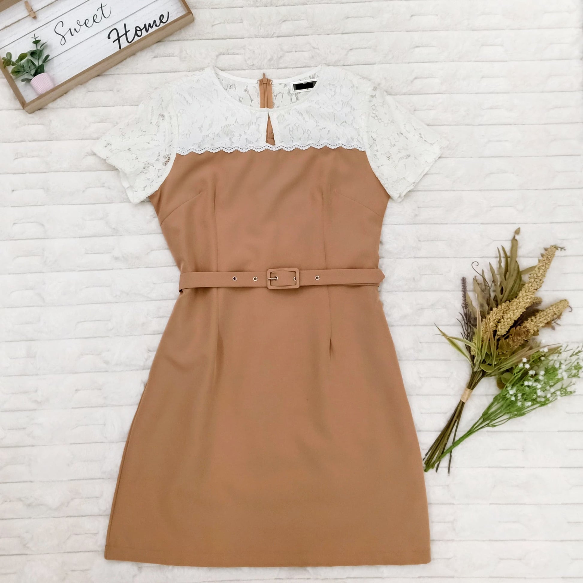 Keyhole Neckline Lace Trim Belted Knee-Length Dress