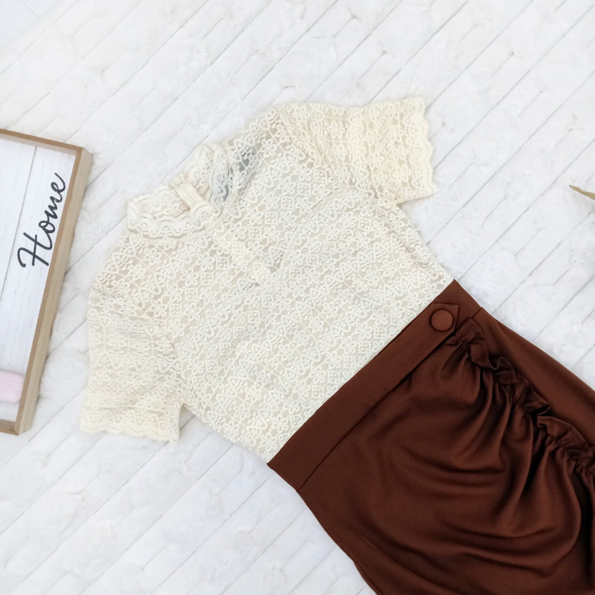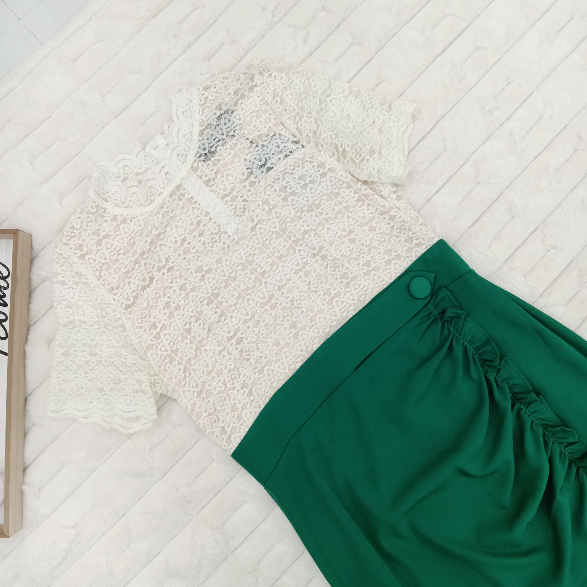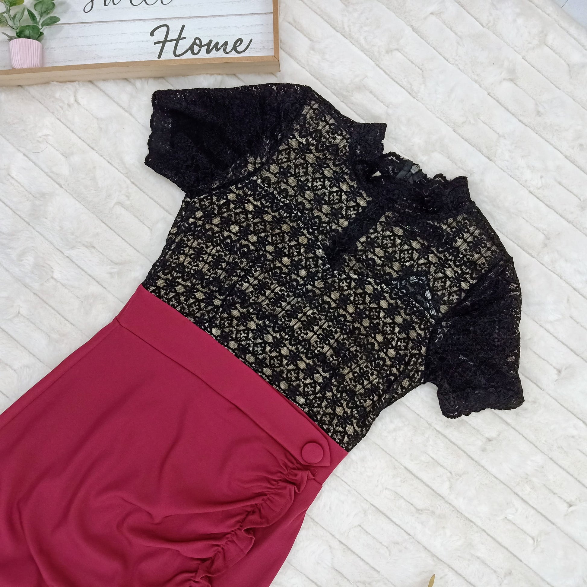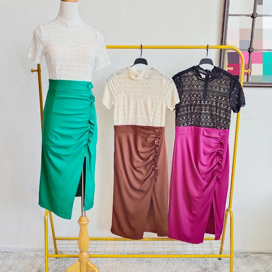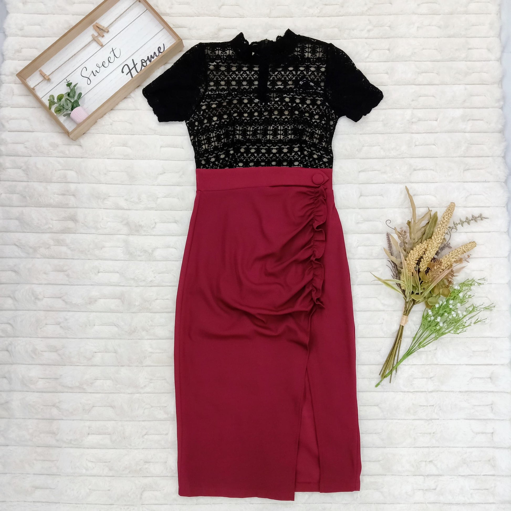 Lace Mock-Neck Ruched with High Slit Midi Dress