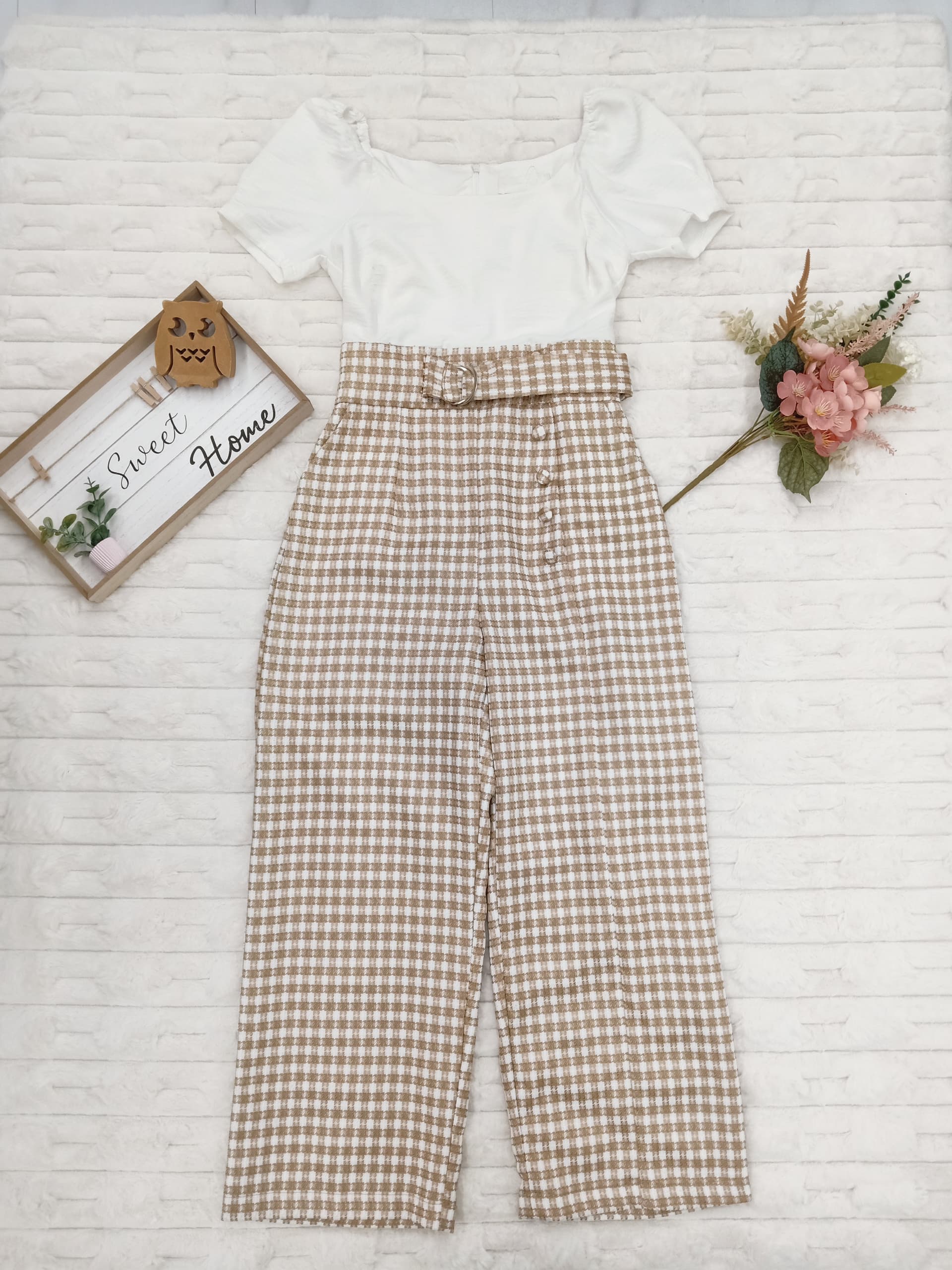 Off-Shoulder Gingham Jumpsuit with Pockets