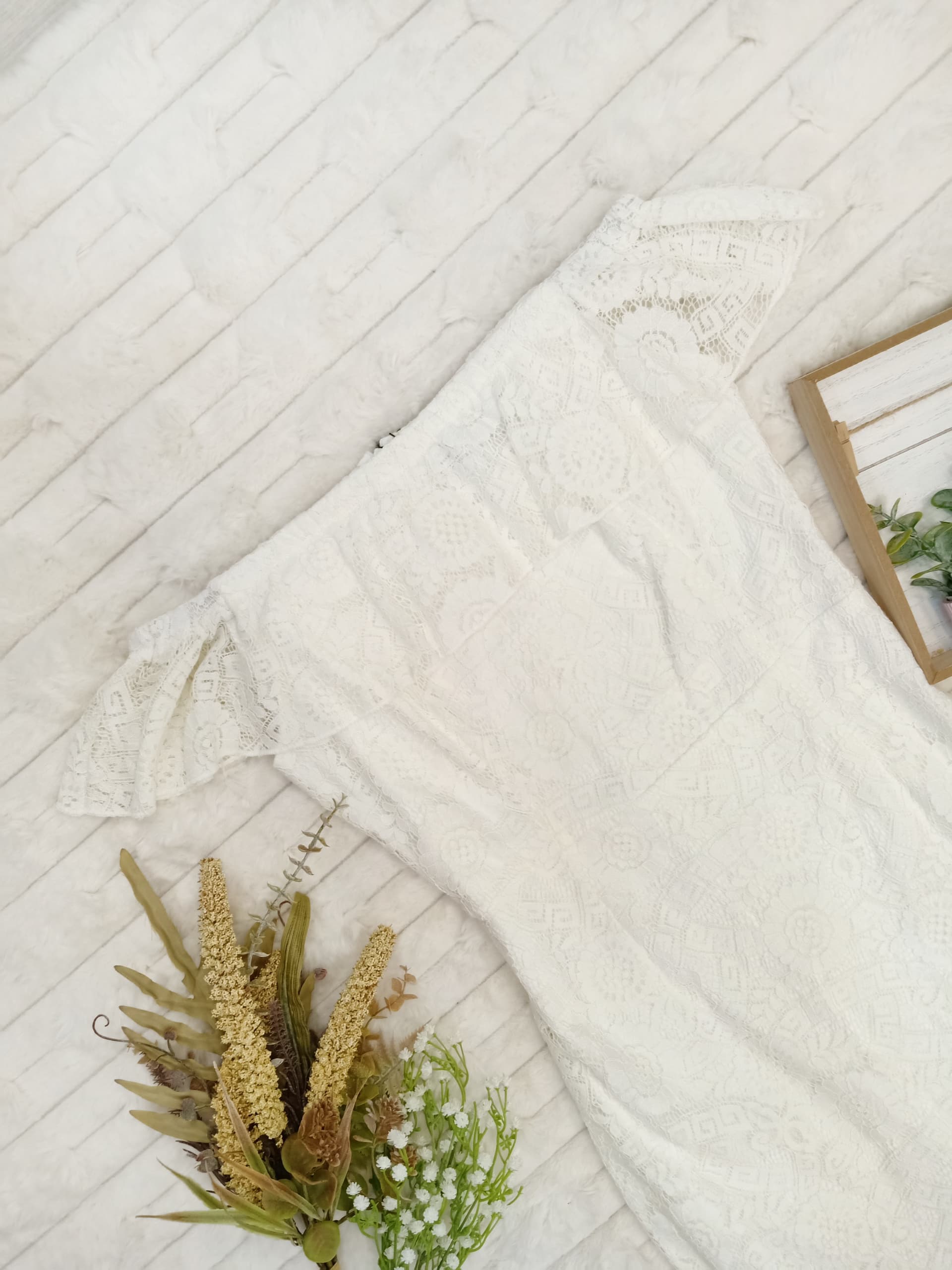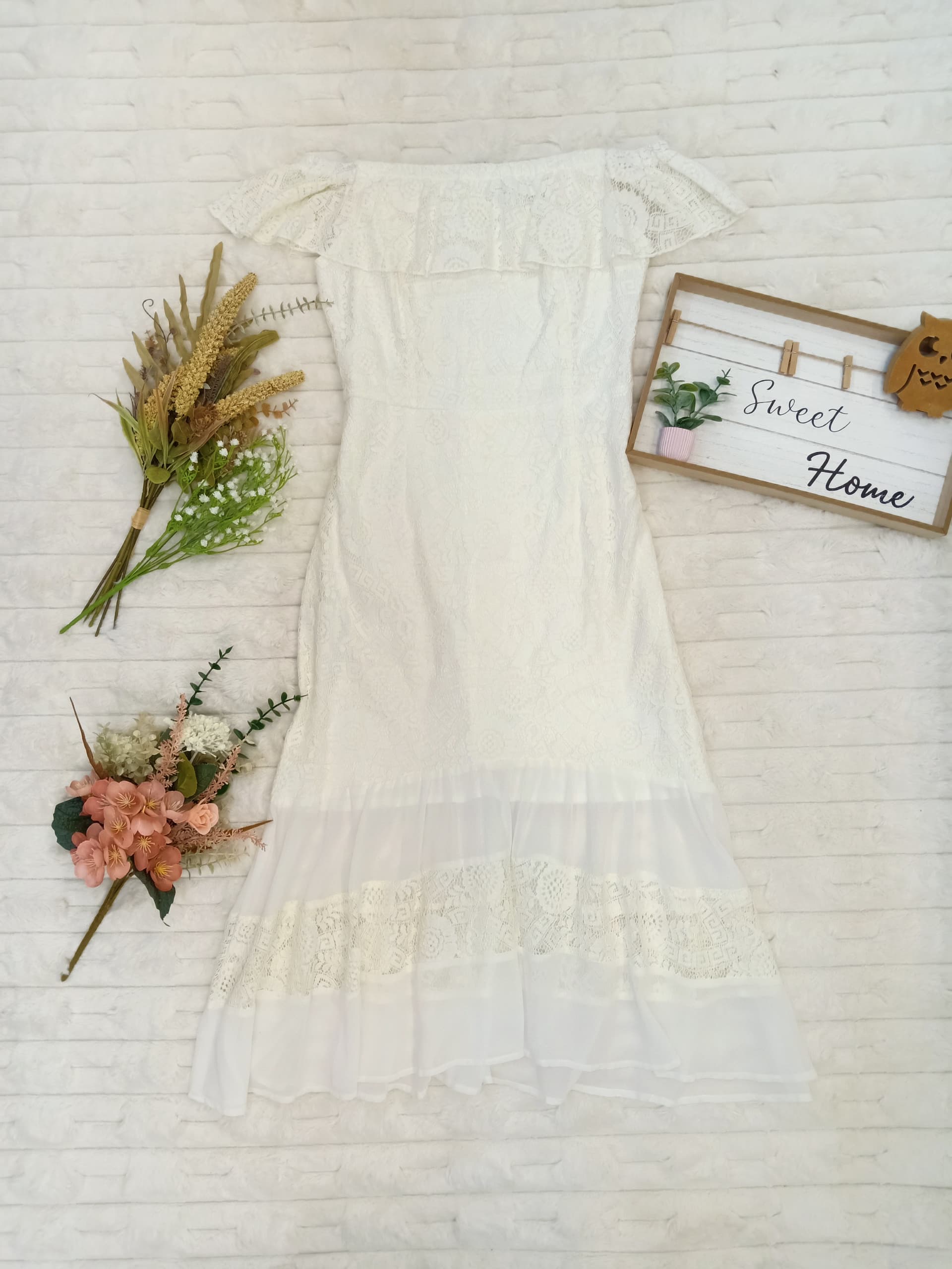 Off-Shoulder Ruffle Front Lace Embroidered Midi Dress