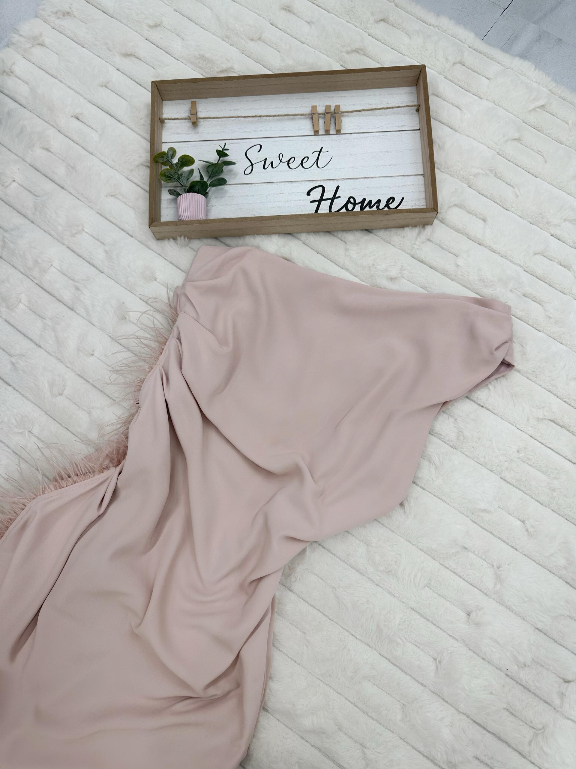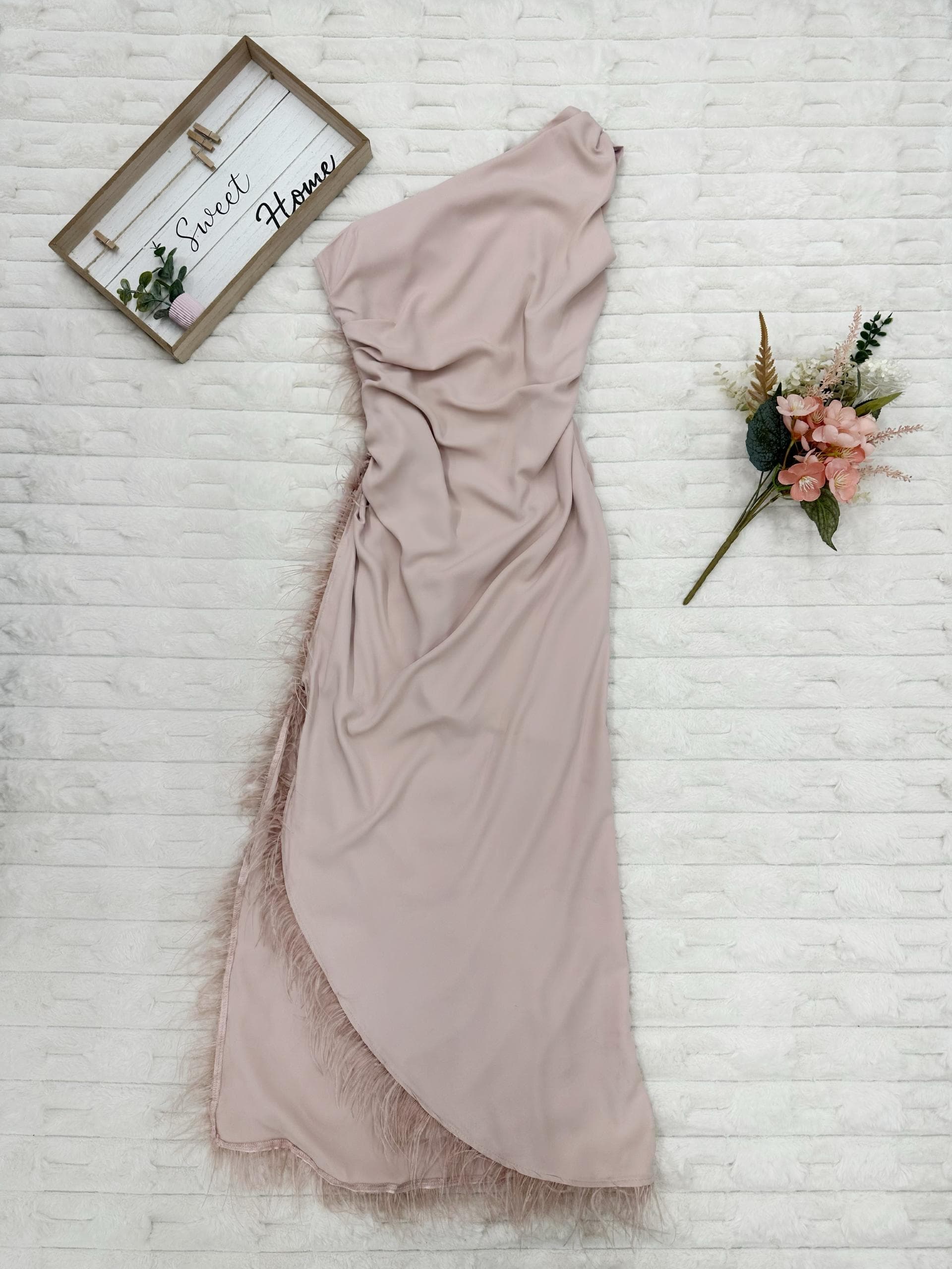 One-Shoulder Feather-Trim with High Slit Maxi Dress