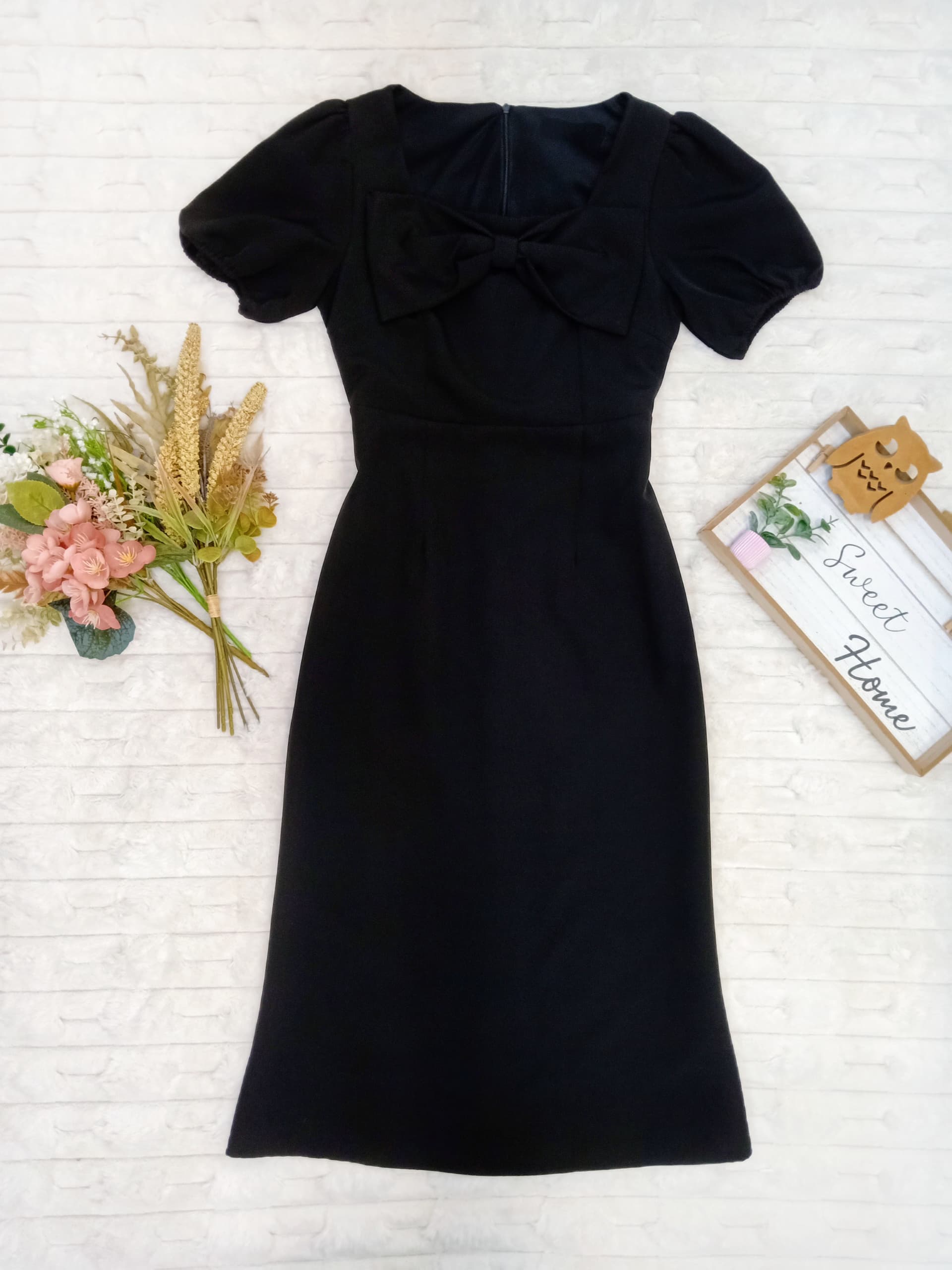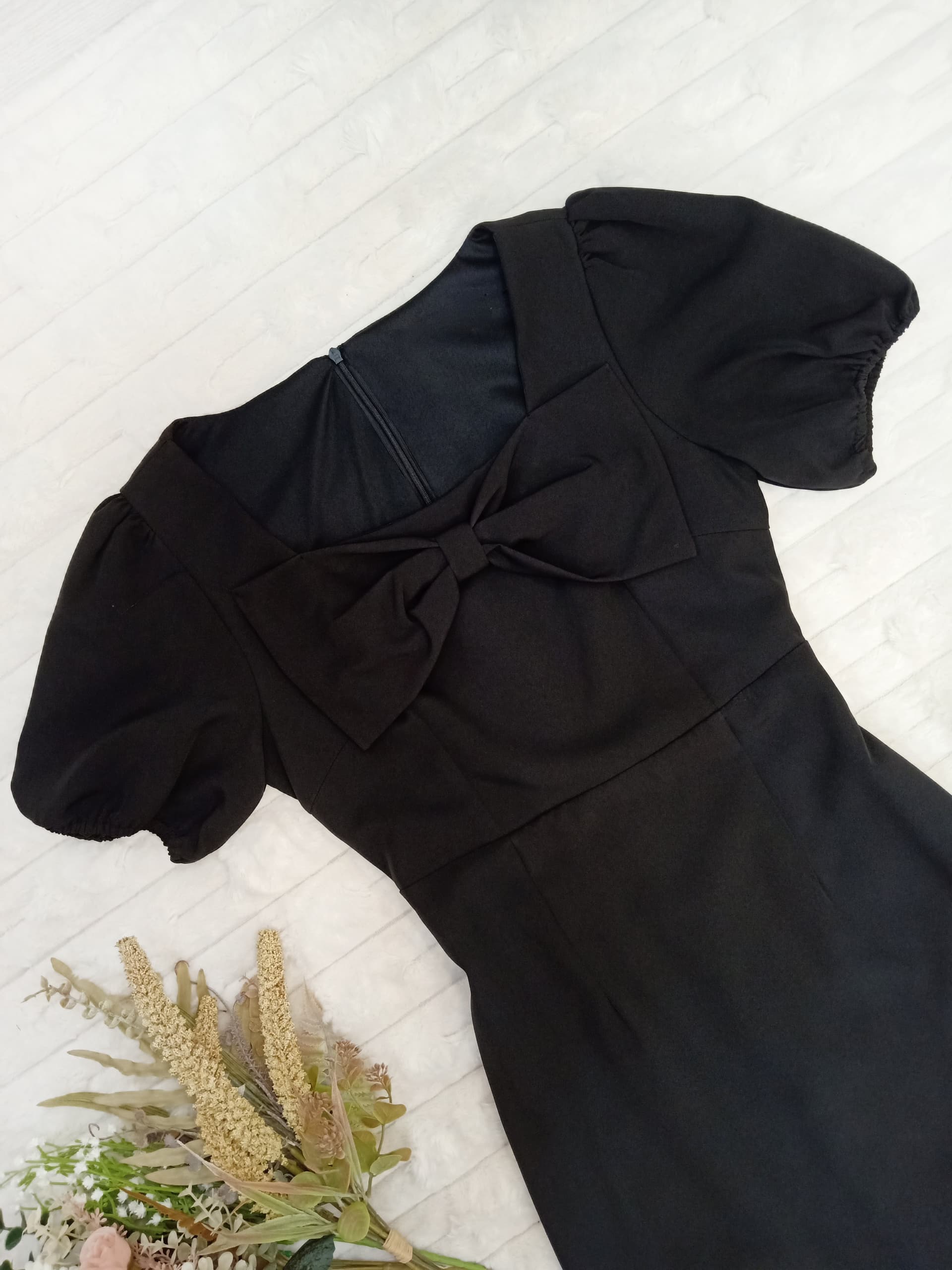 Puff-Sleeves Ribbon Front Mermaid Midi Dress