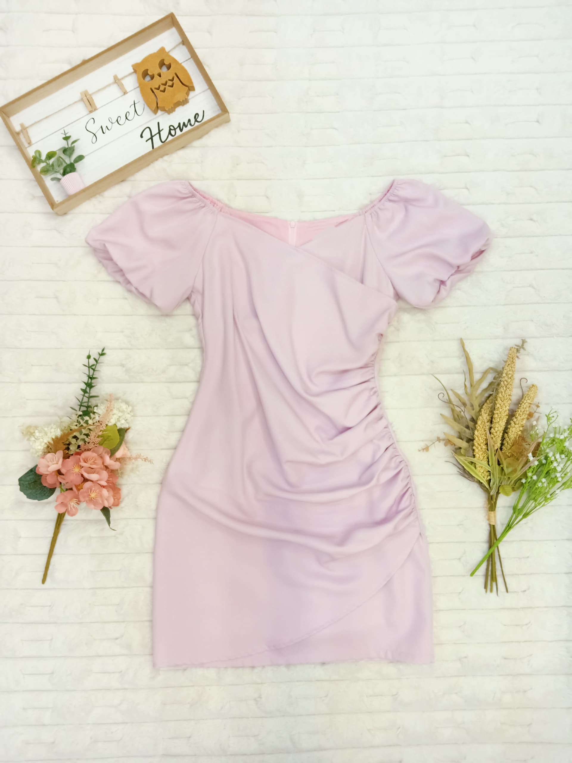 Puff Sleeves Ruched with Asymmetrical Slit Mini Dress