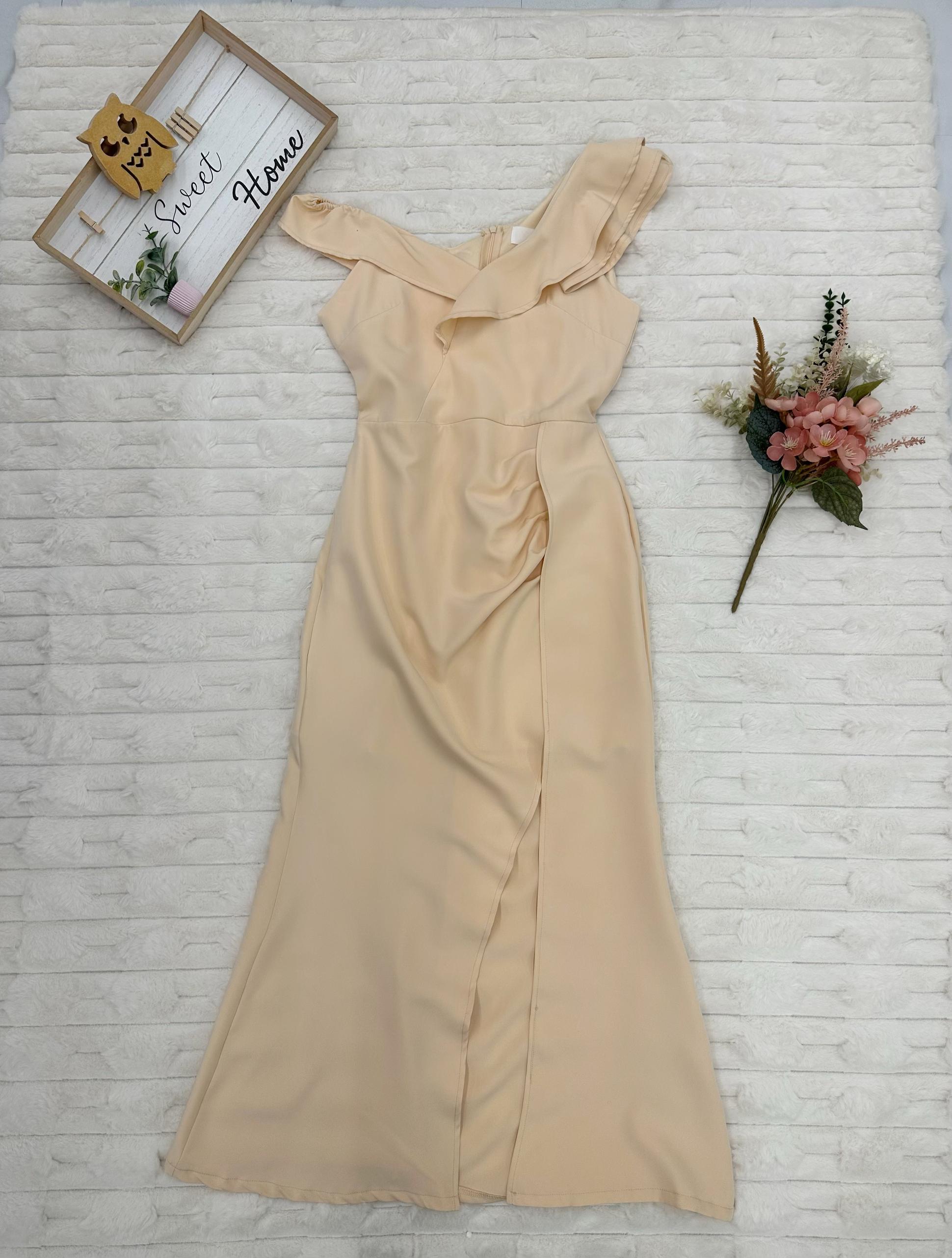 Ruffle One-Shoulder with Draped Asymmetrical High Slit Maxi Dress