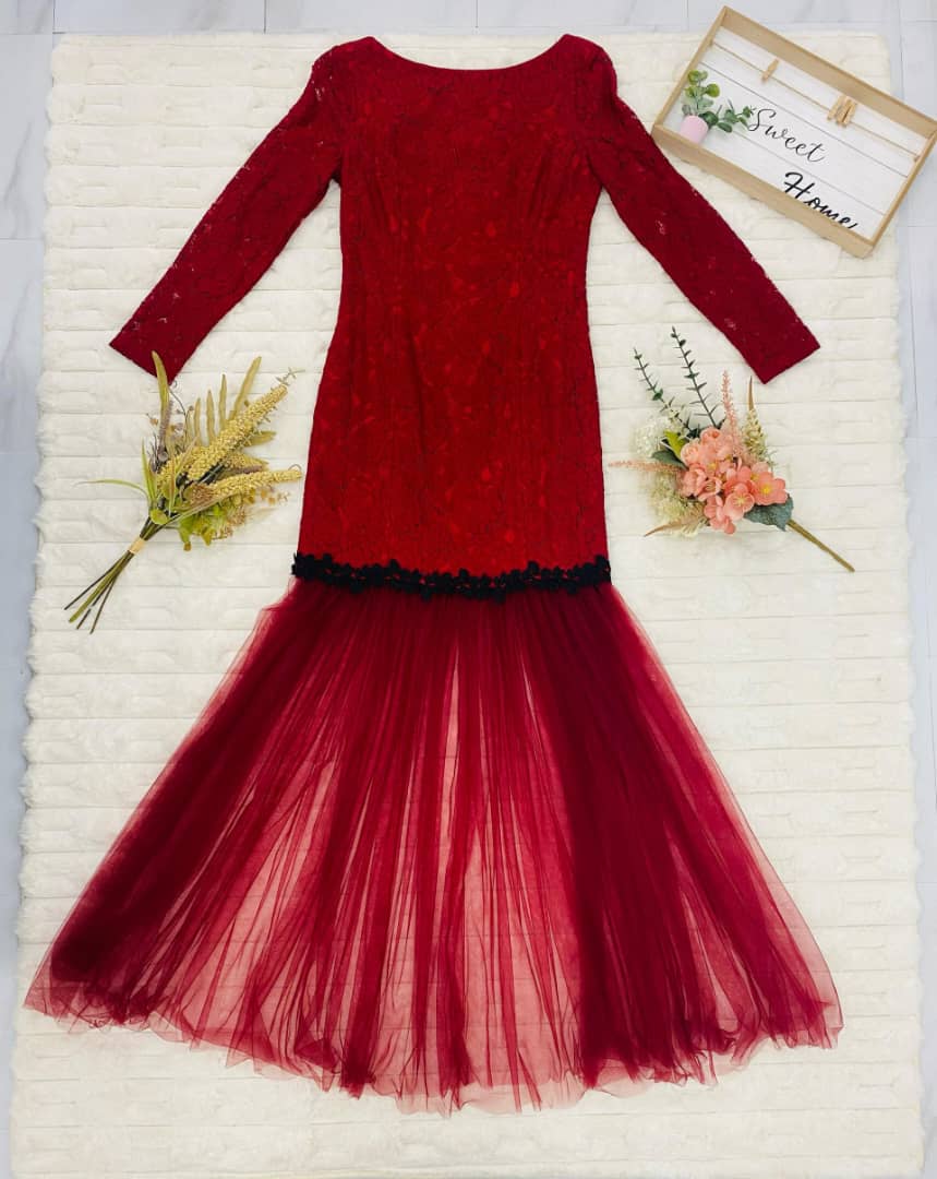 Square Neck Long Sleeve Lace Gown Maxi Dress