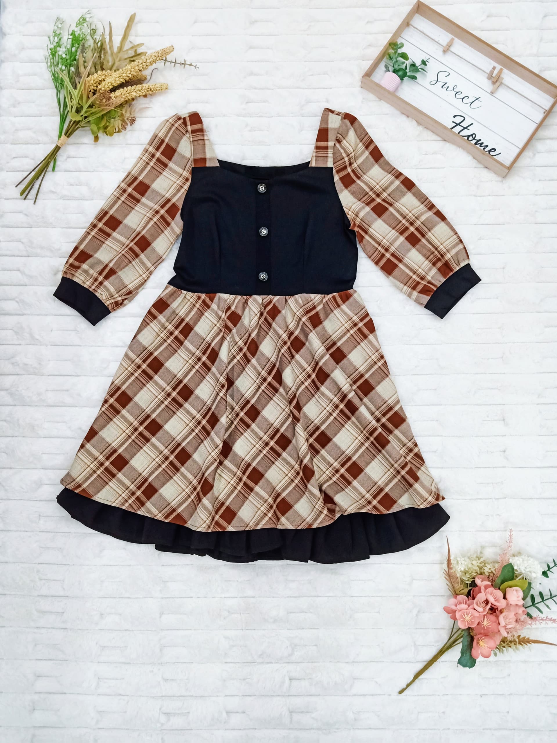Square Neck Long Sleeve Plaid Knee-Length Dress
